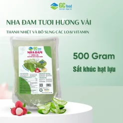 -Thành phần: nha đam (50%), đường (12%), chất điều chỉnh độ Acid (330), hương vải tổng hợp.